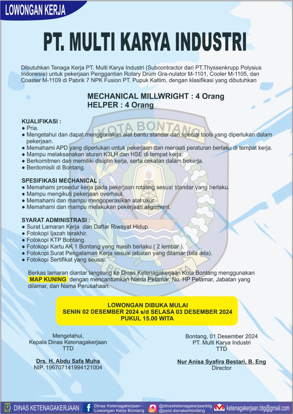 LOWONGAN : PT. MULTI KARYA INDUSTRI